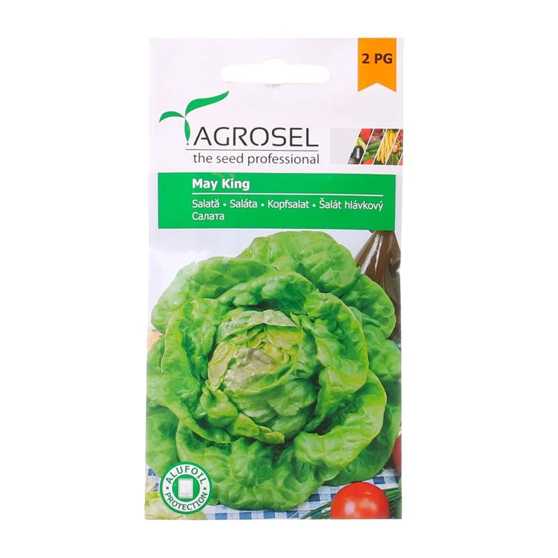 Planteaza seminte de salata May King Agrosel. Obtine capatani de marime medie, culoare verde deschis. Soiul timpuriu produce in 50-60 zile. Cultiva in camp deschis primavara sau toamna. Folosesti salata in salate proaspete. Recoltezi 3-4 kg pe mp in sol fertil.